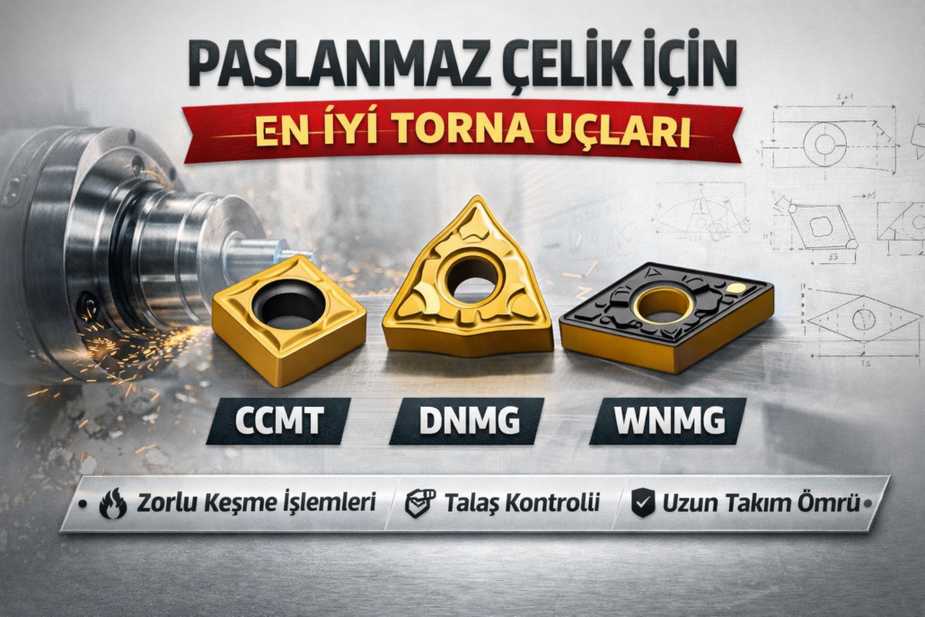 Paslanmaz çelik tornalama işlemleri doğru kesici takım seçimi gerektirir. CCMT, CNMG, DNMG ve WNMG gibi farklı insert tipleri paslanmaz çelik işleme operasyonlarında farklı avantajlar sunar. Doğru torna ucu seçimi sayesinde üretim kalitesi artar, takım ömrü uzar ve maliyetler düşer.